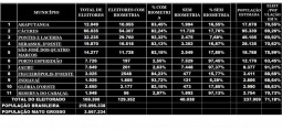 Já o município com maior índice de habilitados a votar é Jauru, cuja população é 8.377 sendo que 91,31% ou 7.649 estão credenciados a fazer uso do voto. O índice de eleitores habilitados a votar usando biometria, em Jauru é muito baixo, somente 2,63%.