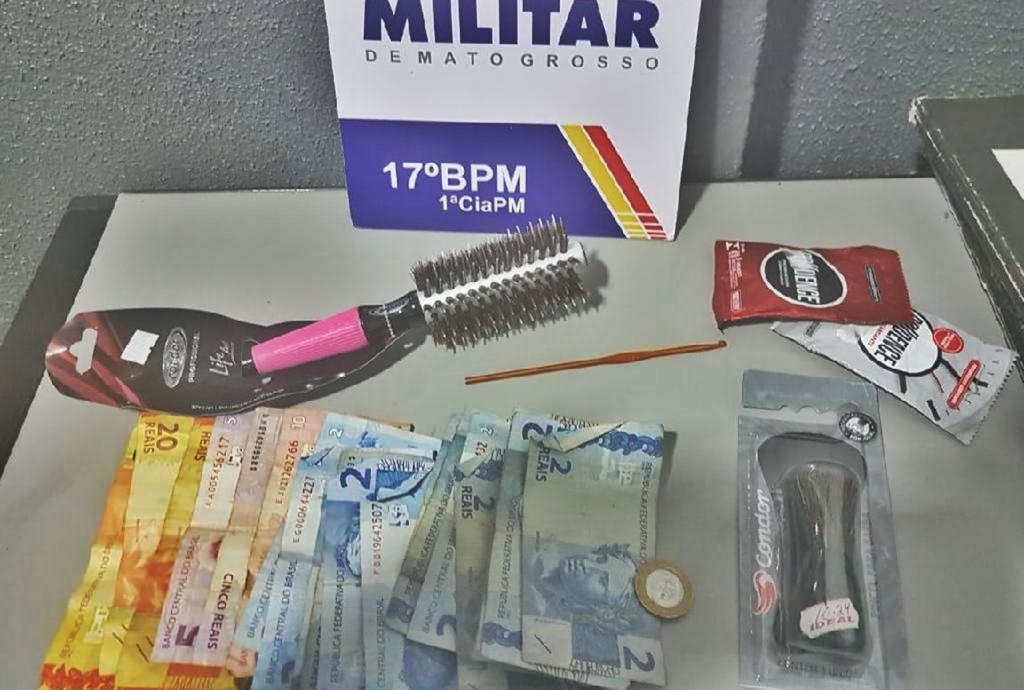 No atendimento a ocorrência de roubo a uma supermercado os militares estavam em ronda quando viram o suspeito com as mesmas características e usando tornozeleira eletrônica. Na abordagem, ele carregava vários produtos com etiquetas de um dos comércios, além de dinheiro. Questionado, não soube dizer a procedência do material.