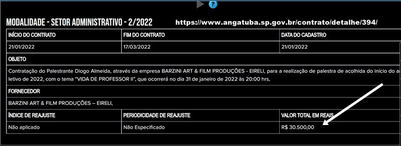 Com população estimada em 25.724 pessoas, em 21/01/2022 o município de Angatuba-SP pagou R$30.500,00 ao mesmo profissional que palestrará no dia 11 de outubro em Araputanga. A informação está disponível no site da prefeitura e pode ser vista clicando aqui.