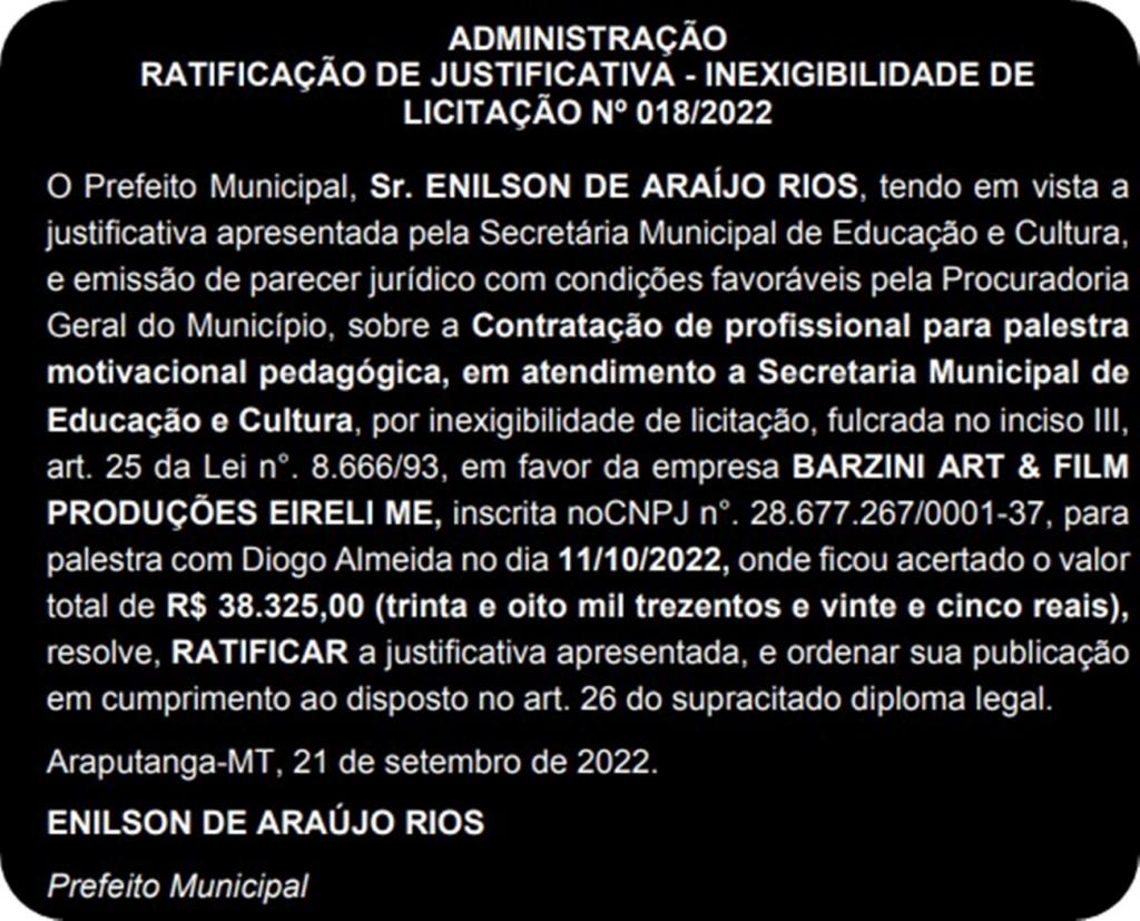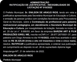 por – Sebastião Amorim – A Prefeitura Municipal de Araputanga, publicou hoje (22/09), na Imprensa Oficial, a contratação de empresa responsável por trazer profissional para palestra motivacional pedagógica, a ser proferida em Araputanga, no próximo dia 11 de outubro/2022.