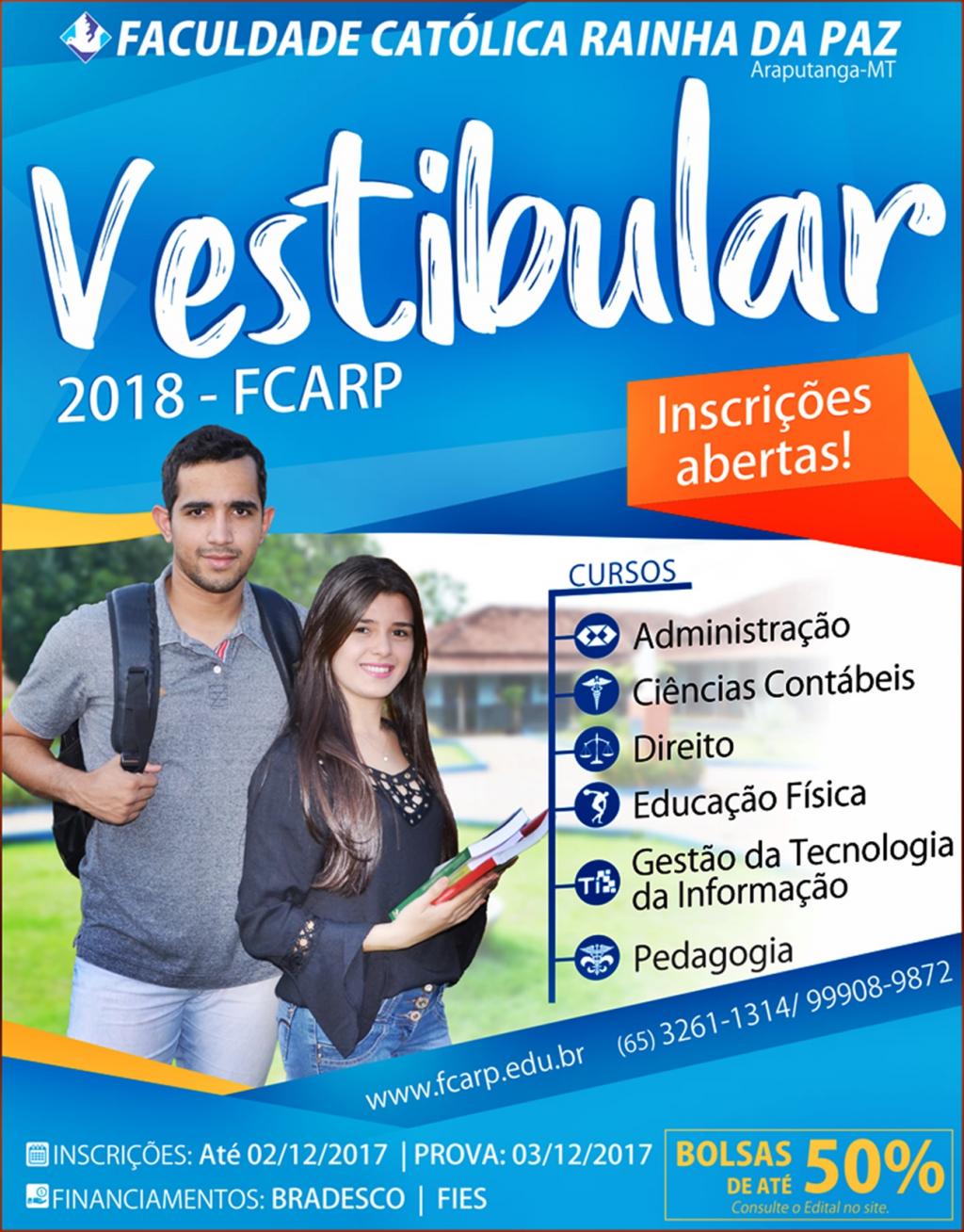 A Faculdade Católica Rainha da Paz – FCARP, Recredenciada pela Portaria 1.304 de 17/11/2016, publicada no D.O.U. de 18/11/2016, pág. 22, Seção I, torna público aos interessados que estarão abertas no período de 27 de outubro a 02 de dezembro de 2017, através do site www.fcarp.edu.br, as inscrições do Processo Seletivo 2018. O Concurso Vestibular oferecerá 430 (quatrocentos e trinta) vagas, distribuídas entre os seguintes Cursos de Graduação: 01 - Administração – (Bacharelado), Reconhecimento: Portaria nº 703 de 18/12/2013, publicada no D.O.U. de 19/12/2013, pág. 130, 50 vagas, turno noturno; 02 - Ciências Contábeis – (Bacharelado), Reconhecimento: Portaria nº 267 de 03/04/2017 - D.O.U. de 04/04/2017, pág. 70/76, 80 vagas, turno noturno; 03 - Direito – (Bacharelado), Reconhecimento: Portaria nº 267 de 03/04/2017 - D.O.U. de 04/04/2017, pág. 70/76,100 vagas, turno noturno; 04 - Educação Física – (Licenciatura), Reconhecimento: Portaria 433 de 15/05/2017, D.O.U. – 17/05/2017, pag. 21, seção 1, 50 vagas, turno noturno; 05 – Gestão da Tecnologia da Informação – (Tecnológico), Reconhecimento: Portaria nº 127, de 28/04/2016, publicada no D.O.U. de 02/05/2016, pag. 26, 100 vagas, sendo no turno matutino 50 vagas e no turno noturno 50 vagas; 06 – Pedagogia – (Licenciatura), Autorizado pela Portaria nº 332 de 05/05/2015 – D.O.U. de 06/05/2015, pág. 15 - 50 vagas, turno noturno. A Faculdade reserva-se o direito de não instalar qualquer turma prevista, caso não haja um número superior às vagas existentes, neste processo seletivo, de alunos matriculados. O Processo Seletivo constará de duas provas objetivas num total de 30 questões, sendo 20 questões de Língua Portuguesa e 10 de Matemática e de uma prova de Produção de Texto. O Concurso Vestibular será realizado no dia 03 de dezembro 2017 das 14 às 18 horas, horário oficial do Estado de Mato Grosso. Comissão de Vestibular/FCARP. Araputanga-MT, 25 de setembro de 2017. Publique-se.