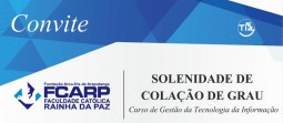 A Diretoria da Faculdade Católica Rainha da Paz e o Presidente da Fundação Arco-Íris de Araputanga-MT têm a honra de convidar Vossa Senhoria e ilustríssima família para assistirem à solenidade de Colação de Grau do curso de Gestão da Tecnologia da Informação, que será realizada nos dias 16 e 17 de agosto de 2017, conforme programação: