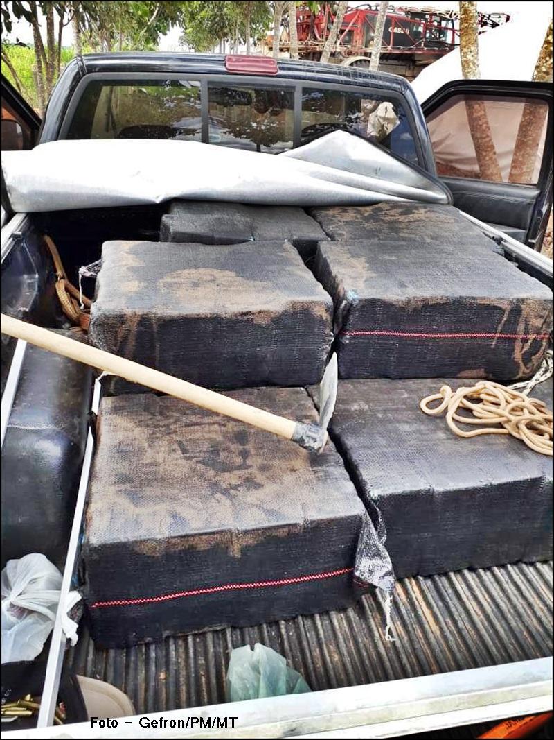 por - Débora Siqueira | Sesp/MT - Uma operação conjunta entre Polícia Federal, Grupo Especial de Fronteira (Gefron) e Polícia Militar de Comodoro resultou na apreensão de 432,8 quilos de cocaína transportados em 10 fardos em duas caminhonetes S-10. Quatro pessoas foram presas e armas também foram apreendidas na manhã de terça-feira (19.03), em local de difícil acesso na zona rural do município.