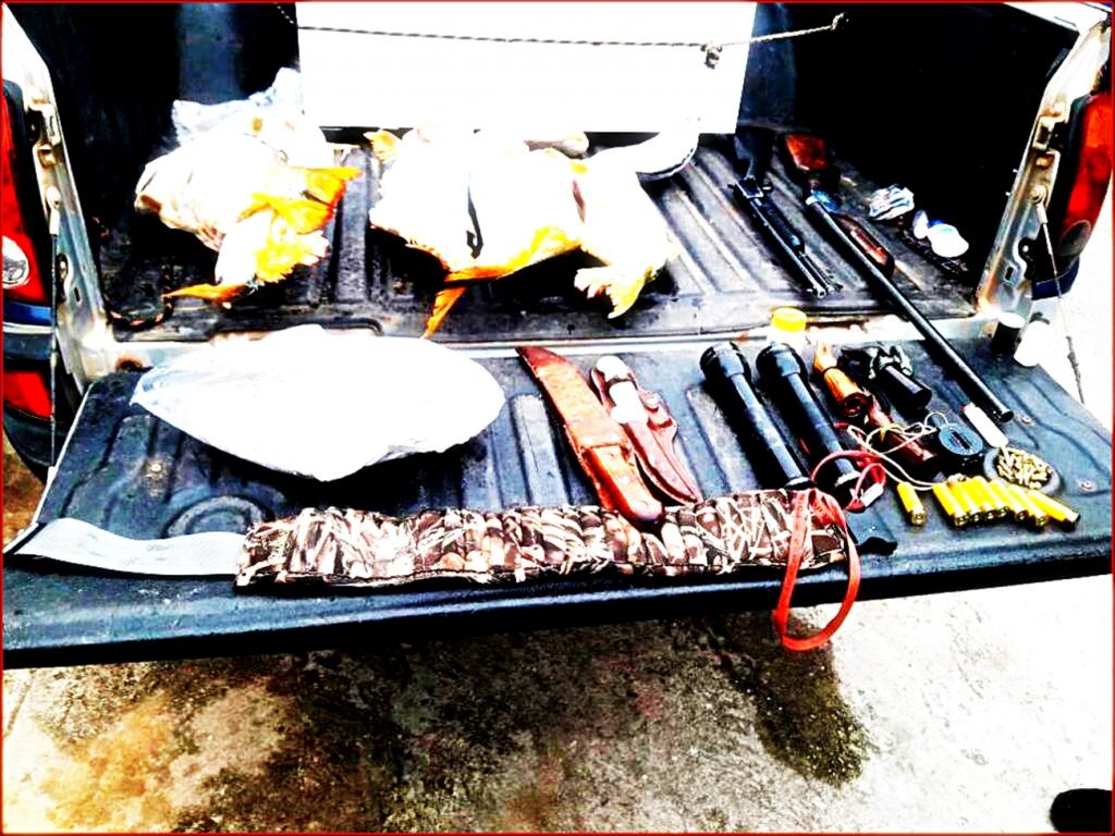 Na casa também havia uma carabina com 36 munições e uma espingarda com 8 munições. Duas mochilas com diversos materiais para pesca e caças foram localizadas, nela também estavam duas redes, três pios para atrair aves, duas lanternas, dez cordas de seda, lona e algumas roupas.
