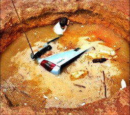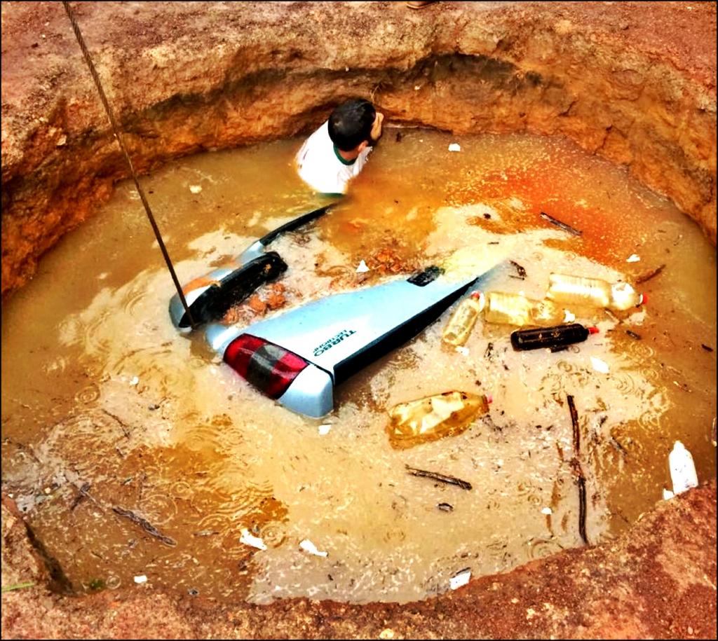 Ao retornar não acreditou no que havia acontecido, foram poucos minutos, e ai notou que sua camionete estava dentro do buraco tomado pelas enxurradas da chuva forte que caia no momento.