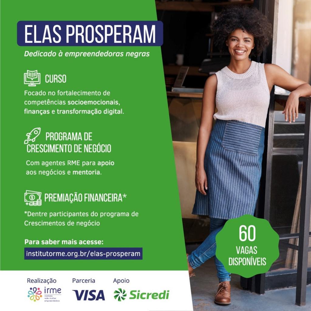 Com o objetivo de fomentar o empreendedorismo e a educação financeira para mulheres, o Sicredi está apoiando o programa “Elas Prosperam”, iniciativa promovida em parceria com a Visa e o Instituto Rede Mulher Empreendedora, para apoio e desenvolvimento de 60 empreendedoras autodeclaradas negras. As inscrições para participar do projeto se encerram no próximo domingo, dia 28 de março.