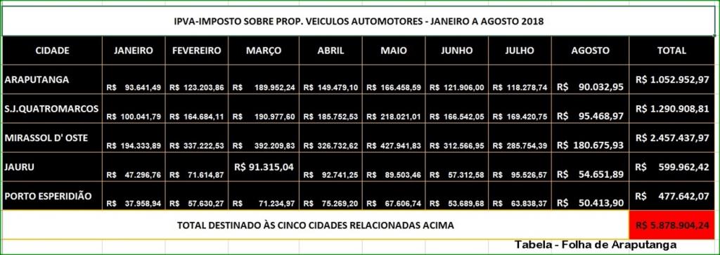 por - Sebastião Amorim - Os valores transferidos aos cofres municipais, a título de IPVA, entre os meses de Janeiro a Agosto de 2018, em favor dos Municípios de Araputanga, São José dos Quatro Marcos, Mirassol D’ Oeste, Jauru e Porto Esperidião, alcançaram o total de R$ 5.878.904,24 cinco milhões, oitocentos e setenta e oito mil, novecentos e quatro reais.