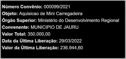 por - Sebastião Amorim - O município de Jauru-MT recebeu no dia 29 de março 2022 R$236.944,60 do Ministério do Desenvolvimento Regional (MDR), através do convênio número 99/2021 para adquirir uma minicarregadeira.