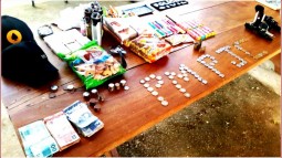 Realizadas as buscas nos suspeitos, foi encontrado R$445 reais e 03 celulares. As armas utilizadas no roubo estaria escondidas em um matagal , nas proximidades e, foram localizadas.