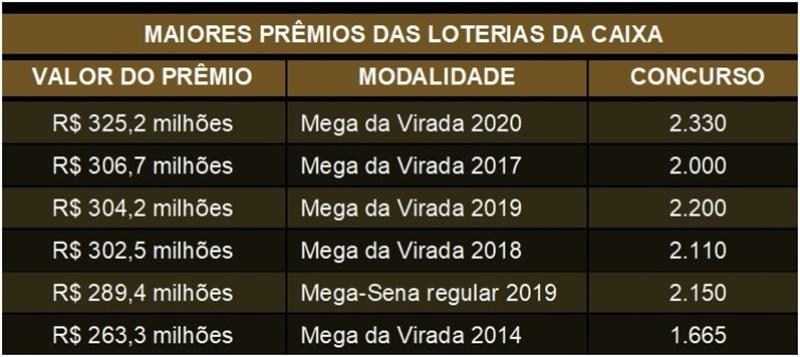 O prêmio de hoje é o maior da história das Loterias CAIXA e bateu o recorde anterior, que era de R$ 306,7 milhões, ofertado na edição de 2017. A bolada será dividida entre duas apostas: uma registrada em Aracaju (SE) e a outra feita em São Paulo (SP), pela internet. Cada uma levará R$ 162.625.108,22.