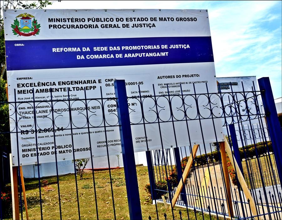 Além da reforma nas dependências da Promotoria de Araputanga, outras obras públicas estão em andamento na cidade. Trata-se da reforma da sede da ULE do Indea-MT (onde chovia dentro), cuja placa com informações, ainda não está disponível ao público neste dia 24/09/18.
