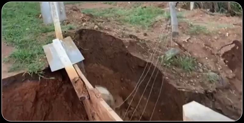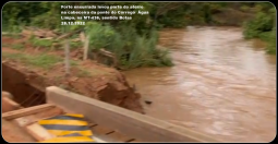 Imagens feitas na tarde de hoje (28/12), mostram que a enxurrada fez enorme buraco no aterro da cabeceira da ponte, do Córrego Água Limpa, impedindo totalmente a trafegabilidade de veículos.