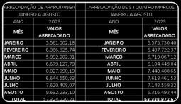 No período que cobriu os oito primeiros meses de 2023, a Prefeitura arrecadou R$57.324.220,21 (cinquenta e sete milhões, trezentos e vinte e quatro mil, duzentos e vinte reais).