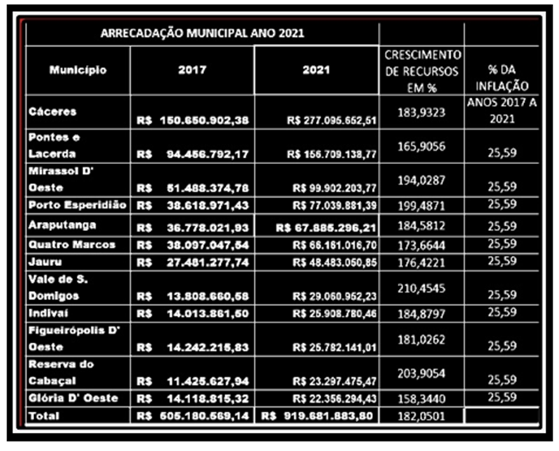 O valor recebido em 2021 nas contas da Prefeitura de Araputanga é 184,58% maior que os R$36.778.021,03 recebido em 2017 primeiro ano da gestão do então prefeito J. Marins. A montanha de dinheiro de 2021 é de dar inveja em gestores que governaram o município em outros tempos.