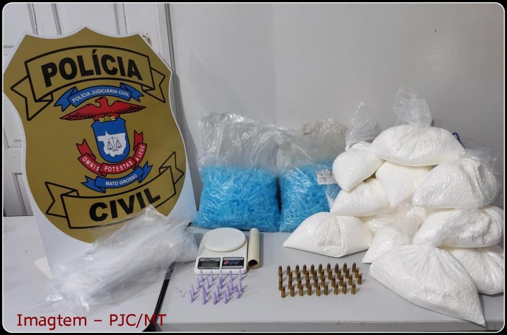 Na casa, ainda foram encontrados 19 pinos de cocaína, balança de precisão e outros apetrechos. O material apreendido estava na casa de um criminoso detido esta semana, em Araputanga, ocasião em que apresentou documento falso e foi detido em flagrante com outra quantidade do mesmo insumo químico.