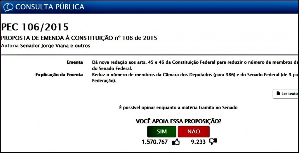 Apesar da reclamação popular quanto ao custo financeirom para manutenção dos políticos na Câmara dos Deputados e no Sendo Federal, na prática, poucos cidadãos têm dado atenção à proposta de redução no número de deputados e senadores; trata-se da Proposta de Emenda à Constituição – PEC 106/2015 de autoria do senador Jorge Viana e outros, que está disponível para receber manifestação do povo, através da internet.