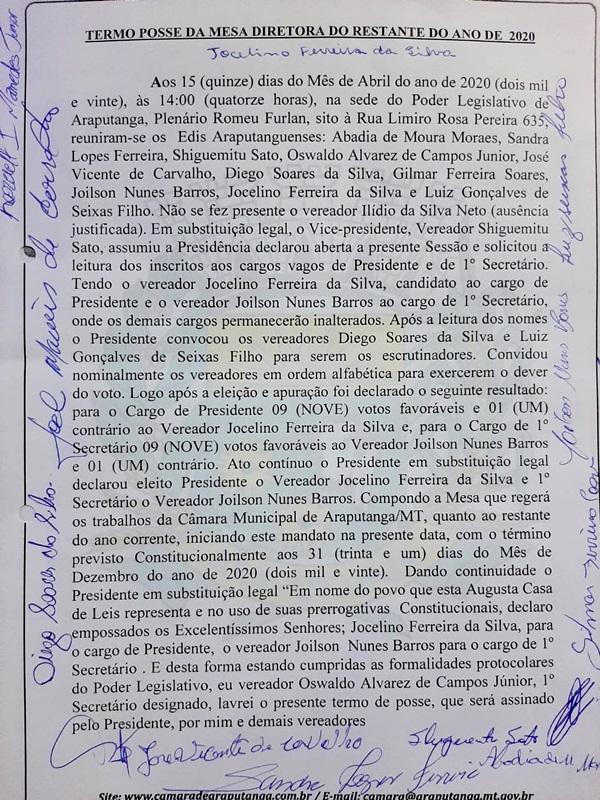 Permanecem inalterados os demais cargos dos vereadores que já compunham a Mesa Diretora; foi lavrado o Termo de Posse da Mesa Diretora, para o restante do ano 2020. vereador Ilídio da Silva Neto, não se fez presente à Sessão.