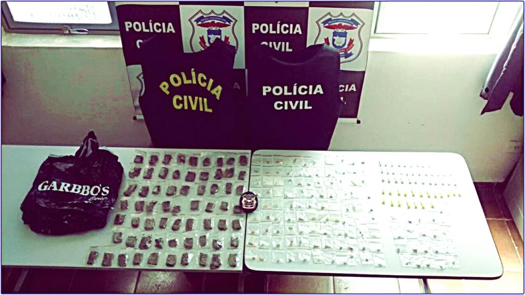 A equipe de policiais civis foi até o local e encontrou duas sacolas contento ao todo, 120 porções de crack, 56 porções de cocaína e mais 64 porções de maconha.