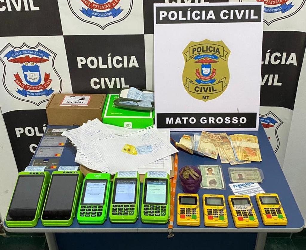 Assessoria | Polícia Civil-MT - Um casal envolvido em vários golpes de estelionato e associação criminosa foi preso pela Polícia Civil de Sinop (500 km ao norte de Cuiabá), na manhã desta quarta-feira (29.07). A ação deflagrada pela 1ª Delegacia de Polícia de Sinop resultou na apreensão de diversas máquinas de cartão de crédito, documentos contendo a contabilidade dos crimes, extratos bancários, entre outros.