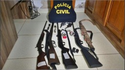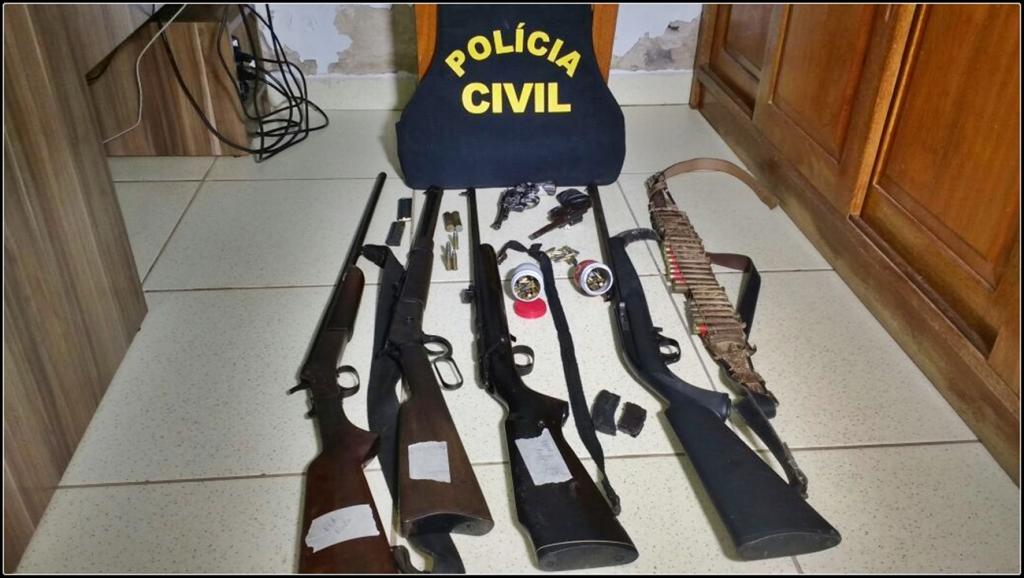 Em buscas na casa, foram apreendidas três armas de fogo (espingarda 28, carabina 22, revólver 22) e na residência do vizinho outras três armas (carabina 38, rifle 22, revólver 22).