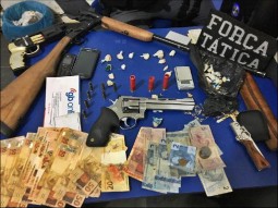 Os Militares da Força Tática realizavam rondas a procura de bandidos que assaltaram uma fazenda quando abordaram um automóvel taxi saindo de uma mata. Durante a revista veicular foram encontrados 36 papelotes de pasta base de cocaína, 01 resolver cal 38 e 01 espingarda cal 28, ambos municiados.