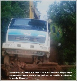 Na tarde de hoje (04) um acidente ocorrido com um caminhão do PAC-2 da Prefeitura de Araputanga comprovou que as condições realmente não são boas. Consta que o veículo- caçamba transportava terra/cascalho para melhorar a trafegabilidade da estrada e, quando passou sobre a ponte conhecida como ponte do Alípio, no Cem Alqueires (região do Assentamento Floresta), as vigas de madeira apodrecida, não suportaram o peso, cederam, tragando o caminhão que ficou com as rodas dianteiras no ar.