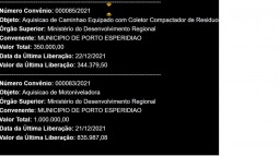 O município de Porto Esperidião recebeu, no dia 22 de dezembro/2021 o montante de R$344.379,50 (trezentos e quarenta e quatro mil, trezentos e setenta e nove reais).