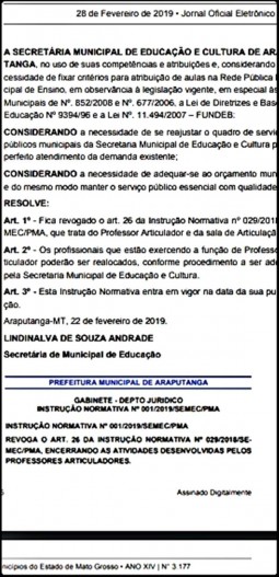 por - Sebastião Amorim - A Secretaria Municipal de Educação e Cultura de Araputanga, determinou o encerramento das atividades desenvolvidas por professores articuladores, no âmbito municipal. A informação veio a conhecimento público, através da Imprensa Oficial dos Municípios, edição de 28/02/2019 nº 3177 páginas 55 e 56.