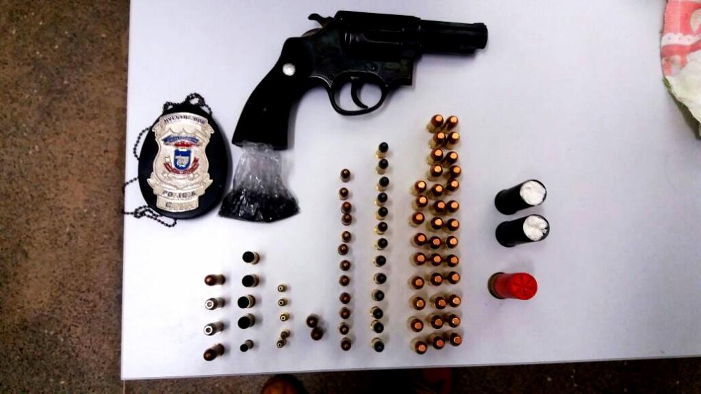 Em flagrante continuado da prisao de Eliseu de Oliveira Figueiredo, realizada pela Polícia Rodoviária Federal, policiais civis levantaram outras informações referente ao suspeito e apreenderam com ele uma espingarda calibre 12 e 32 cartuchos intactos do armamento.