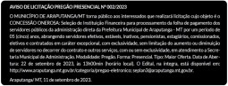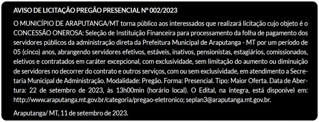 Sem esclarecer o motivo da mudança, o ente municipal publicou, no dia 11/09/2023 novo Edital denominado Pregão Presencial, sob o nº 02/2023 visando à Concessão Onerosa para seleção de Instituição Financeira para processamento da folha de pagamento dos servidores públicos da administração direta da Prefeitura Municipal de Araputanga - MT por um período de 05 (cinco) anos.