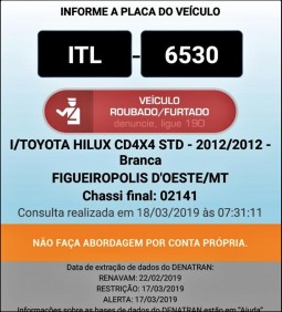 O grupo roubou da família, uma Toyota Hilux Cd4x4 STD, placas ITL 6530 cor branca, ano e modelo 2012, dois relógios de pulso, sendo um feminino, marca Invicta, cor dourada e um relógio masculino marca G Shock, cor preta. Os ladrões levaram, também: