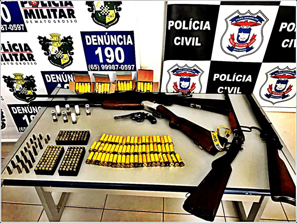 Em buscas na casa do sargento, policiais civis e militares apreenderam duas armas e mais três localizadas na caminhonete dele. Foram apreendidas cinco armas, sendo quatro longas do tipo espingardas e um revólver calibre 38, além de uma grande quantidade de munições de variados calibres.
