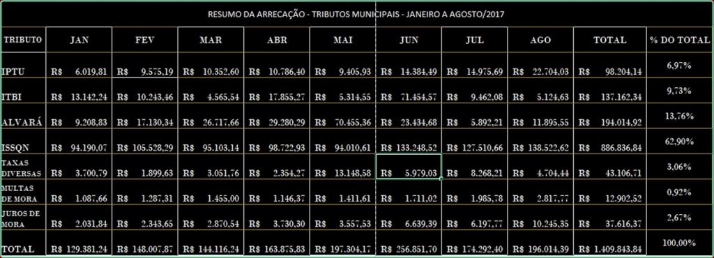 A Redação da Folha de Araputanga fez levantamento, junto ao Setor de Tributos da Prefeitura Municipal, para conhecer o montante arrecadado em tributos municipais, entre janeiro e agosto/2017.