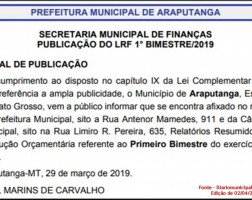por - Sebastião Amorim -O resumo da execução orçamentária referente ao primeiro bimestre, exercício 2019, da Prefeitura Municipal de Araputanga, está disponível aos interessados no Mural