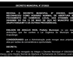 A revogação se dá por razões de conveniência e oportunidade, diz parte do texto do Decreto 37/2023. Fica a lição para políticos pensarem melhor e, que...