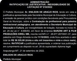 por – Sebastião Amorim – A Prefeitura Municipal de Araputanga, publicou hoje (22/09), na Imprensa Oficial, a contratação de empresa responsável por trazer profissional para palestra...