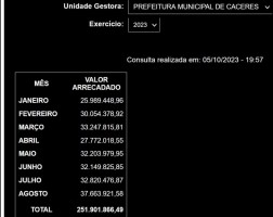 por – Sebastião Amorim – O município de Cáceres, que comemora aniversário hoje (06/10), já arrecadou R$251.90’.866,49 na soma dos oito primeiros meses de 2023. A Redação...