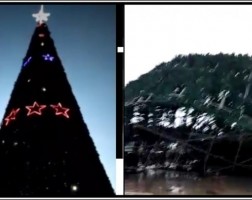 QUATRO MARCOS – Forte ventania derrubou árvore natalina na Praça, em frente à Matriz